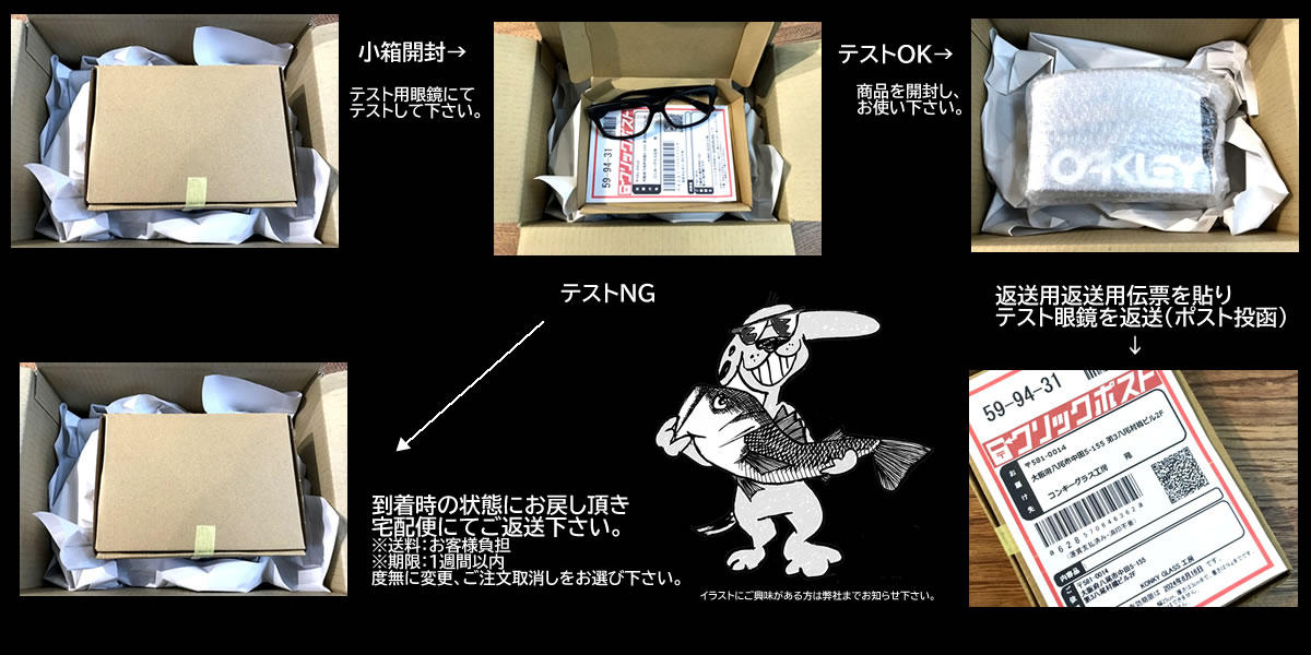 ・適合→商品を開封して下さい。テスト眼鏡は付属の送付票を貼り付けてポストに投函して下さい。