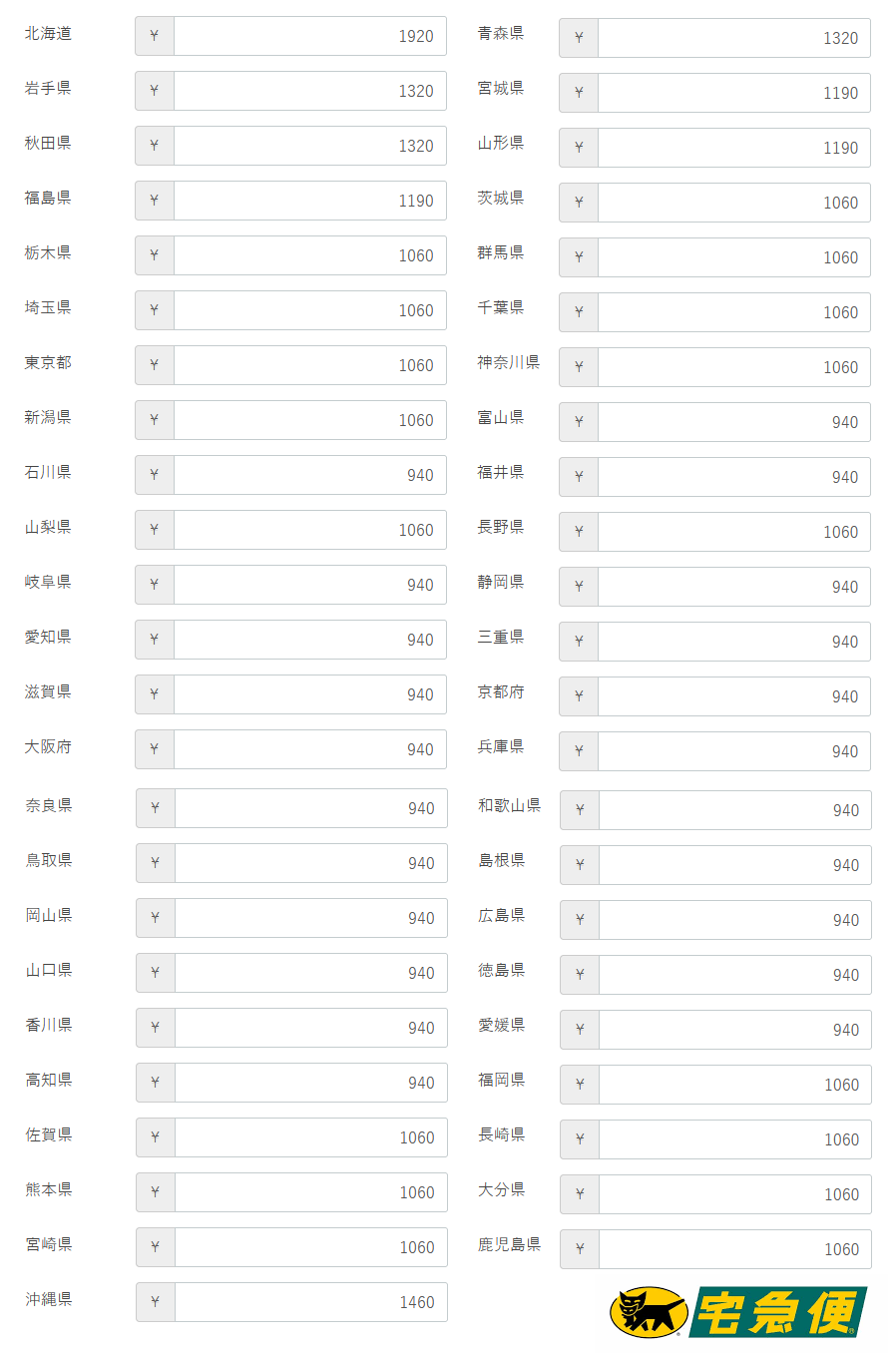 ・クロネコヤマト送料表